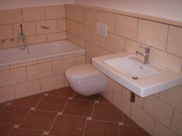 wird der Gesamteindruck durch ein modernes Badezimmer (Badewanne u.
